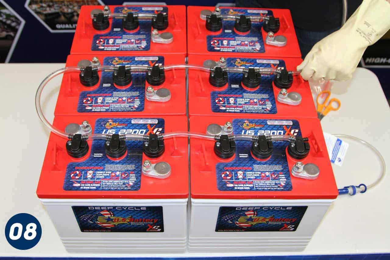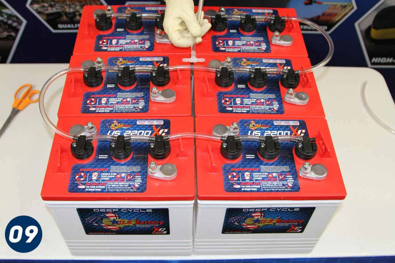 El tanque de llenado por gravedad de 2,5 galones debe colocarse al menos tres pies por encima de la parte superior de las baterías para garantizar un flujo de agua suficiente.